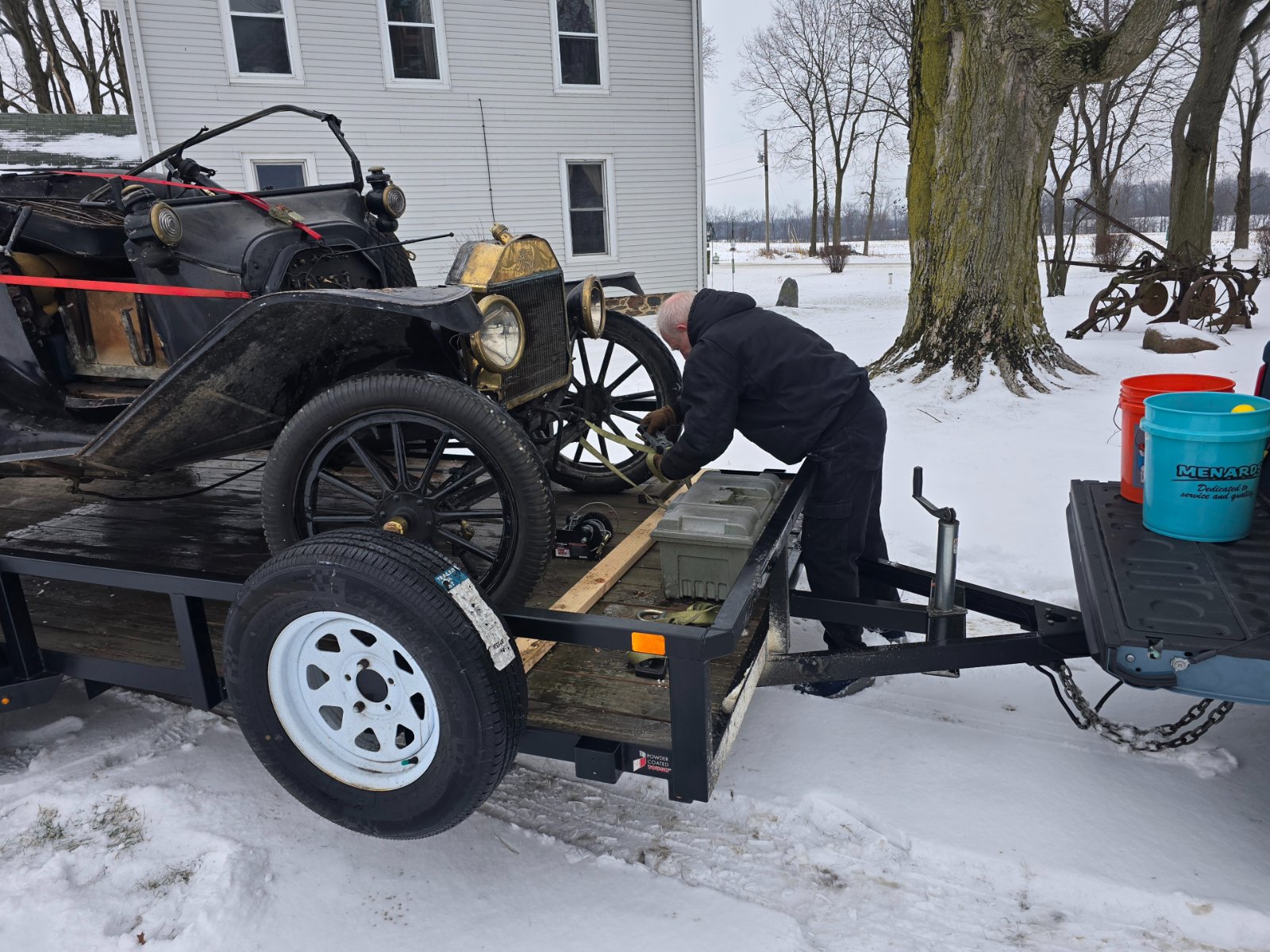 Dave came down from the land of cheese today to get the 15. After almost a year and a half I was still shocked at how bad the damage is. I had swapped a spindle arm so the front wheels were pointed in a similar direction. I pulled the keys from rear axles so it would roll. The frame is bent against the hogshead and it's in gear. After loading all the things Steve had in the car and putting a wheel and tire on, it was ready for Dave. We swapped a wheel so I could keep mine when Dave arrived. My buddy Joe stopped to help us load up and strap down. Thank you Dave and whoever is helping get this to Steve. Steve, I think the oil can, spark plugs, tail light and horn are ok. Safe travels Dave.