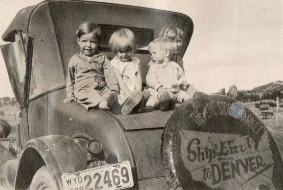 #14 - Cute little ranch kids, 1939 somewhere in Wyoming, a well-used ‘26-7 roadster, with a good, solid top. You know Dad is in the cattle business, the tire cover is a promotion for Denver Stockyards as a shipping point. No need to go to Omaha or Chicago, reach markets anywhere in the country from “dead center !”.