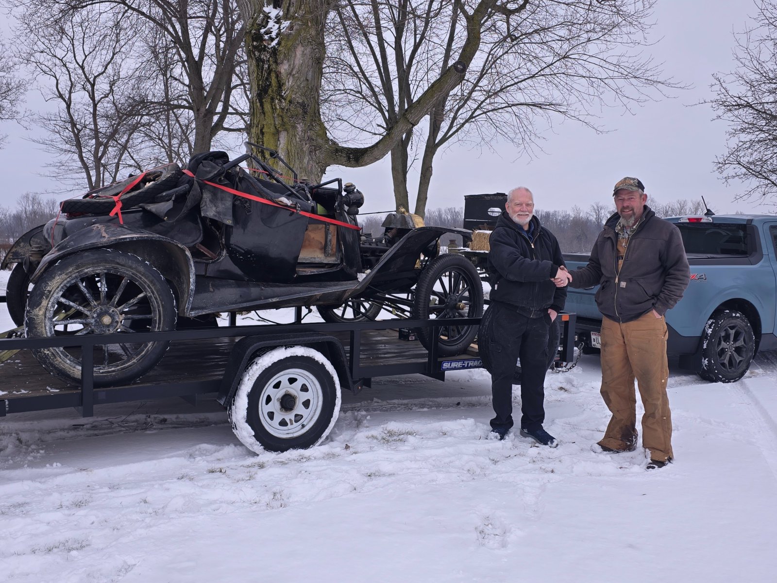 Dave came down from the land of cheese today to get the 15. After almost a year and a half I was still shocked at how bad the damage is. I had swapped a spindle arm so the front wheels were pointed in a similar direction. I pulled the keys from rear axles so it would roll. The frame is bent against the hogshead and it's in gear. After loading all the things Steve had in the car and putting a wheel and tire on, it was ready for Dave. We swapped a wheel so I could keep mine when Dave arrived. My buddy Joe stopped to help us load up and strap down. Thank you Dave and whoever is helping get this to Steve. Steve, I think the oil can, spark plugs, tail light and horn are ok. Safe travels Dave.