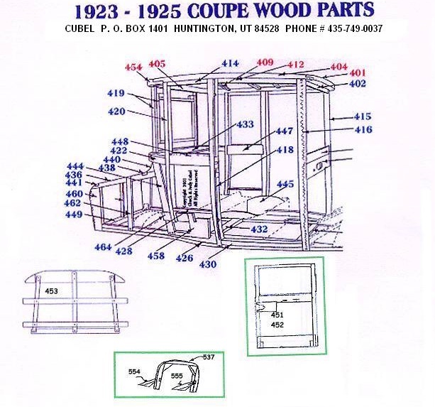 Here is a picture from Fordwood.com of the wood framework for the 23-25 Coupes. Item #453 is the back rest assembly and item #445 are the end pieces on either side of the gas tank.