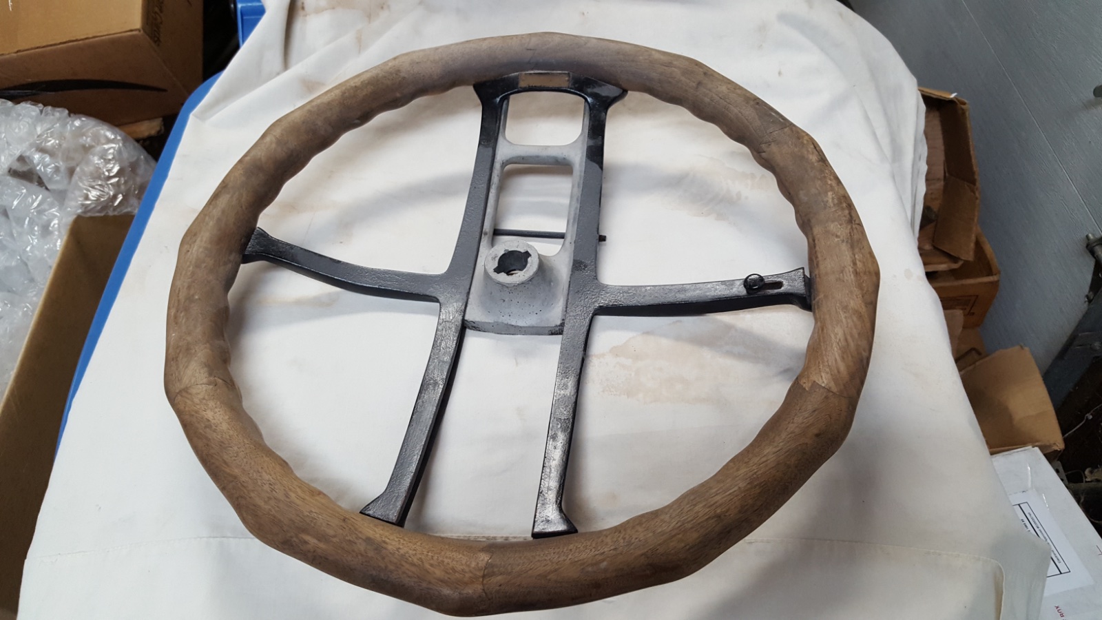 Sliding Neville fatman steering wheel made specifically for Model T Ford, not a conversion from some other make car or universal application, this very rare style is Model T Ford only. This unusual center mount allows the wheel rim to be in the stock T location, many other Nevilles have the wooden rim mounted higher than a stock T. Nice condition, no repairs have ever been done to it and none are needed. Works perfectly. SOLD Happy to answer any questions and supply more pictures.