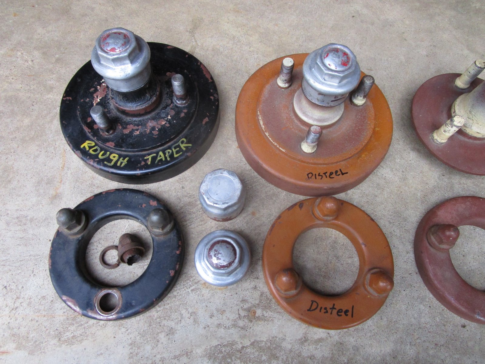 I have for sale a pair of front Disteel front hubs and a pair of Disteel rear hubs with rings and hubcaps. The front hubs are in good shape and other than a good cleanup are useable as-is. The wheel bearing races look good, and I would use them, but I'll leave that up to the buyer. The races are tight in the hubs. The two rear hubs have a few issues. The caramel colored one looks good and has a useable-looking taper and keyway but 2 of the stud bolts have a lot of rusting to the shank of the bolt. That is common on Disteel hubs as the lug nuts tend to hold moisture. The black hub has decent looking stud bolts but has a very rough taper. It was on my car when I got it and it ran OK, but I replaced it several years ago. I was going to try and press out two of the black hubs stud bolts to change out the two studs in the caramel-colored hub. (I have never done that and do not know how hard it will be to do) Then I was going to use the black hub to make a spare tire carrier for my spare. I found an original Disteel spare tire carrier (scarce as hen's teeth) and never got around to using the black hub to make one.