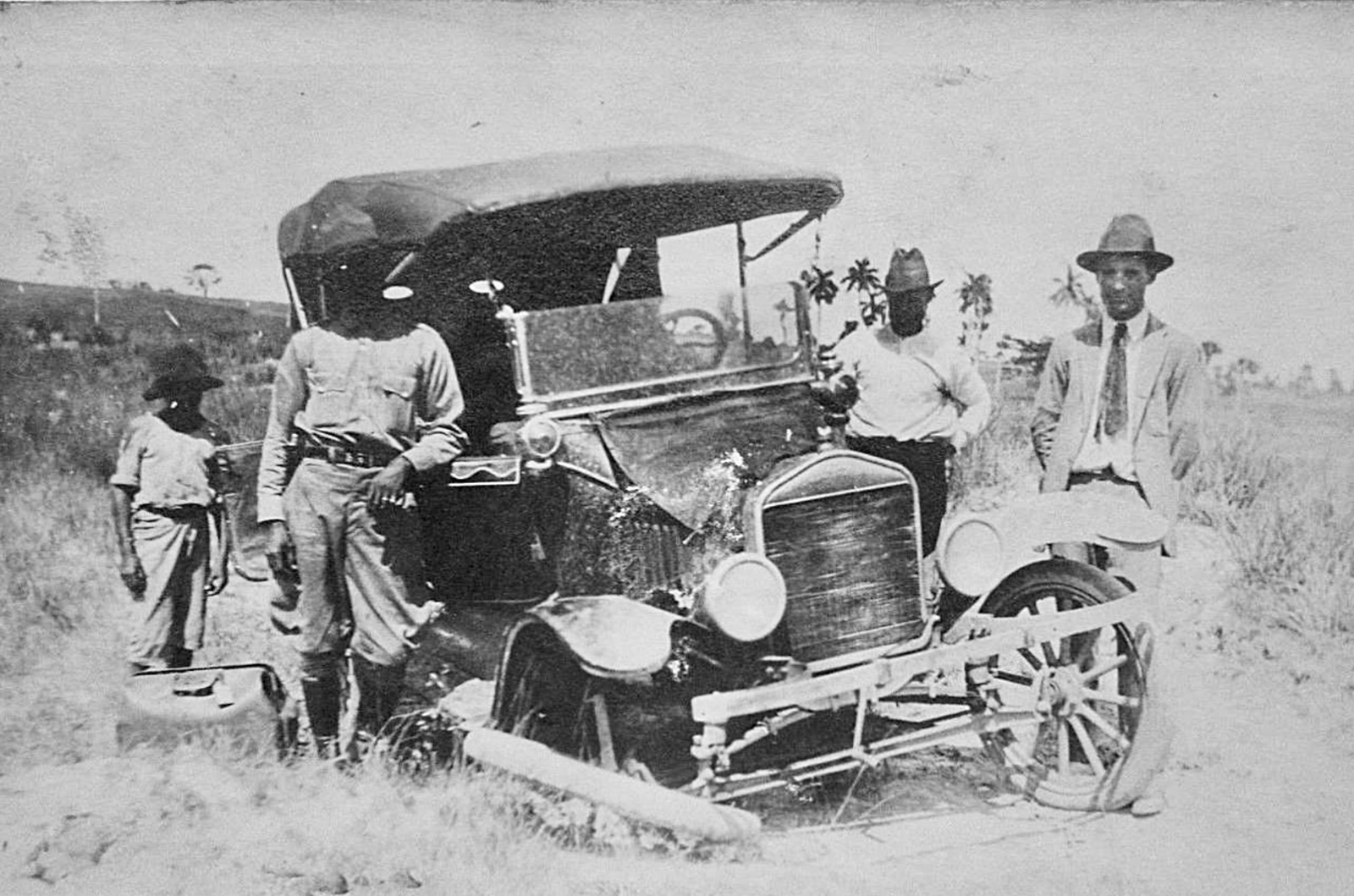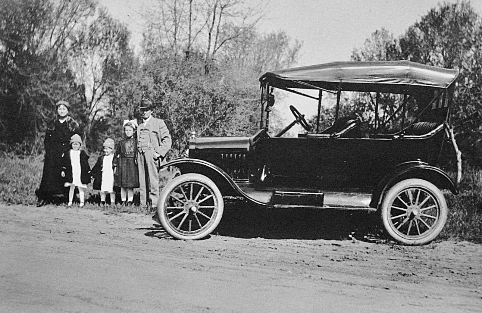 The touring car, with square bottom doors appears to be a 1913. The windshield is 1914 style, hood and rear fenders 1915/'16. Headlamps are electric, and may be later Ford or after-market.