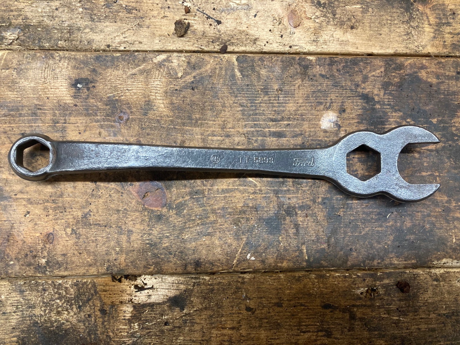 I was lucky today a snagged a TT-5893 wrench at a swap meet. The description that the seller had on the tag read as follows: “Ford TT-5873 only made 1925-1927 for TT truck, spark plug, head bolt, and rim wrench”
