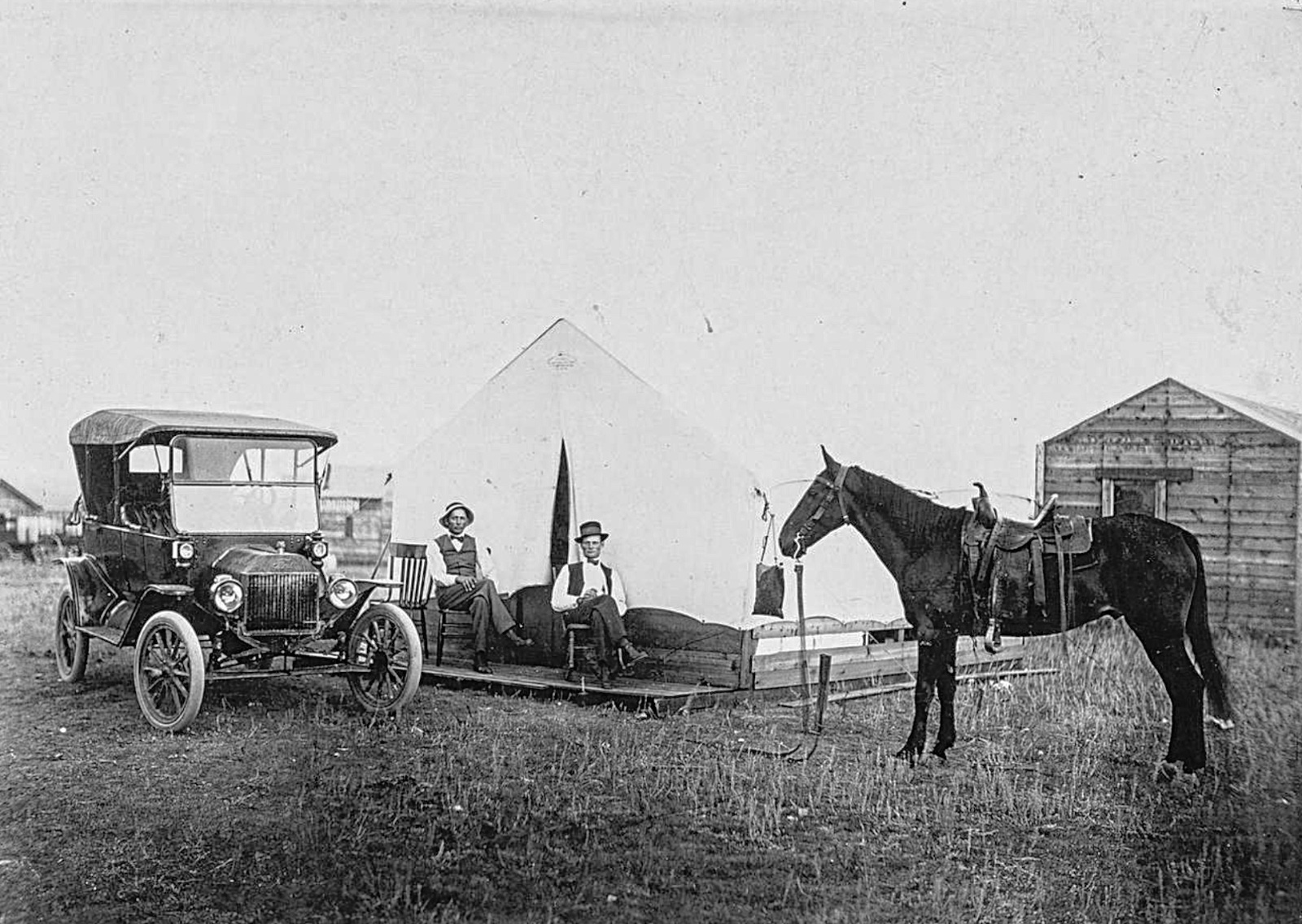 #10 - I’d love to know the story behind this photo. New-looking 1913 with electric lamp conversion (for the side lamps too, maybe ?). That tent is going to be there for the season, with a wooden floor. The two gents look pretty comfortable, and the saddle horse has a real solid ground tie !