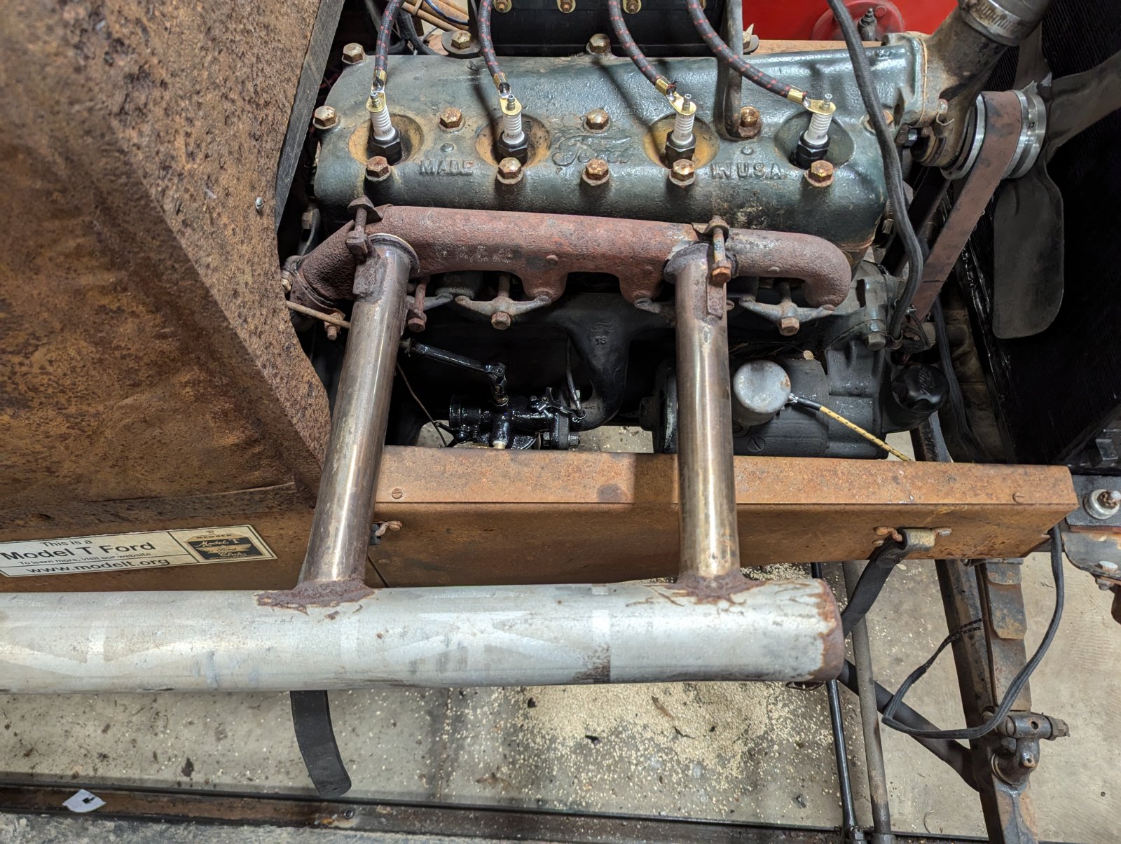 Here is the exhaust picture. The car is a 1927 Model T dirt track racer that Paul Larson owned. The lake pipe has a manual cut off and so does the regular exhaust pipe. You can make it loud or quiet, whatever fits your mood.