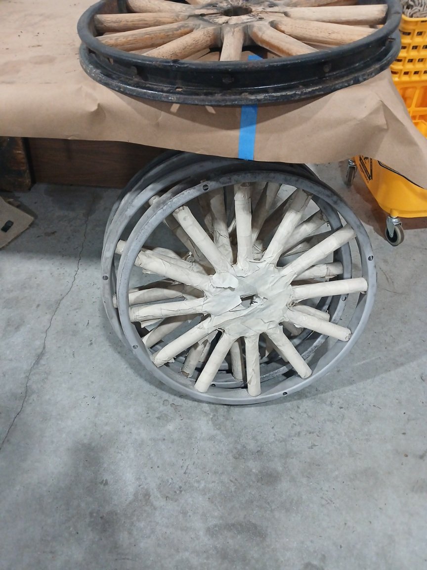 For others, when I worked on the first set of wheels for my roadster buckboard way back in the late 1980's, rather than sand the spokes I hand scraped them. My scrapers were pieces of household window glass cut into 1" x 6" strips. There is nothing like the edge of a piece of glass for this task. The bonus is you get four edges on each piece. When one dulls off, use another and then discard the strip when all four are dulled. With the old paint gone, sanding, with the grain, is not such a time consuming task. I did all four wheels in a week, after spending most of the day out fishing on holidays. Scraping wheels reduced my beverage consumption!