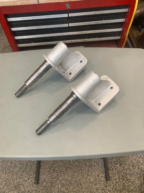 For about forty years, I have had these very unique spindles. They were attached to a wooden beam with T front wheels mounted. I recently took the wheels off, cleaned, bead blasted and primed the brackets intending to sell them. They are nicely machined to spec, T front left and right thread spindle shafts cast into a robust aluminum bracket. I have no idea who made them but I am impressed with the quality of manufacture. I have not chosen a price but, if anyone is interested, send a message with your phone number and I will call.