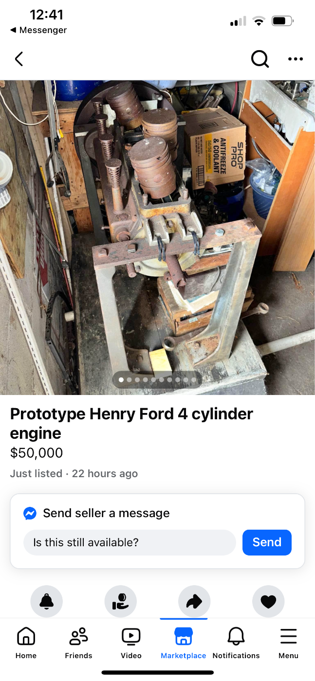 Well, that's interesting! I don't know if it's from a Model B, (my guess is that it's not), but the legs that it's mounted on are definitely from The Henry Ford Museum. They are same as the legs that came with the prototype N engine and the "removeable head" NRS engine on display at Piquette. Both of those were ex-HFM engines as well. And of course, the paperwork in the FB ad confirms the same provenance. However, the description of the Model B engine does not really match the engine in the ad. The description mentions copper clad cylinders, for one thing. This engine has no cylinders. Model B engines had the valves on the opposite side of the engine. This engine has only 4 pushrods???
