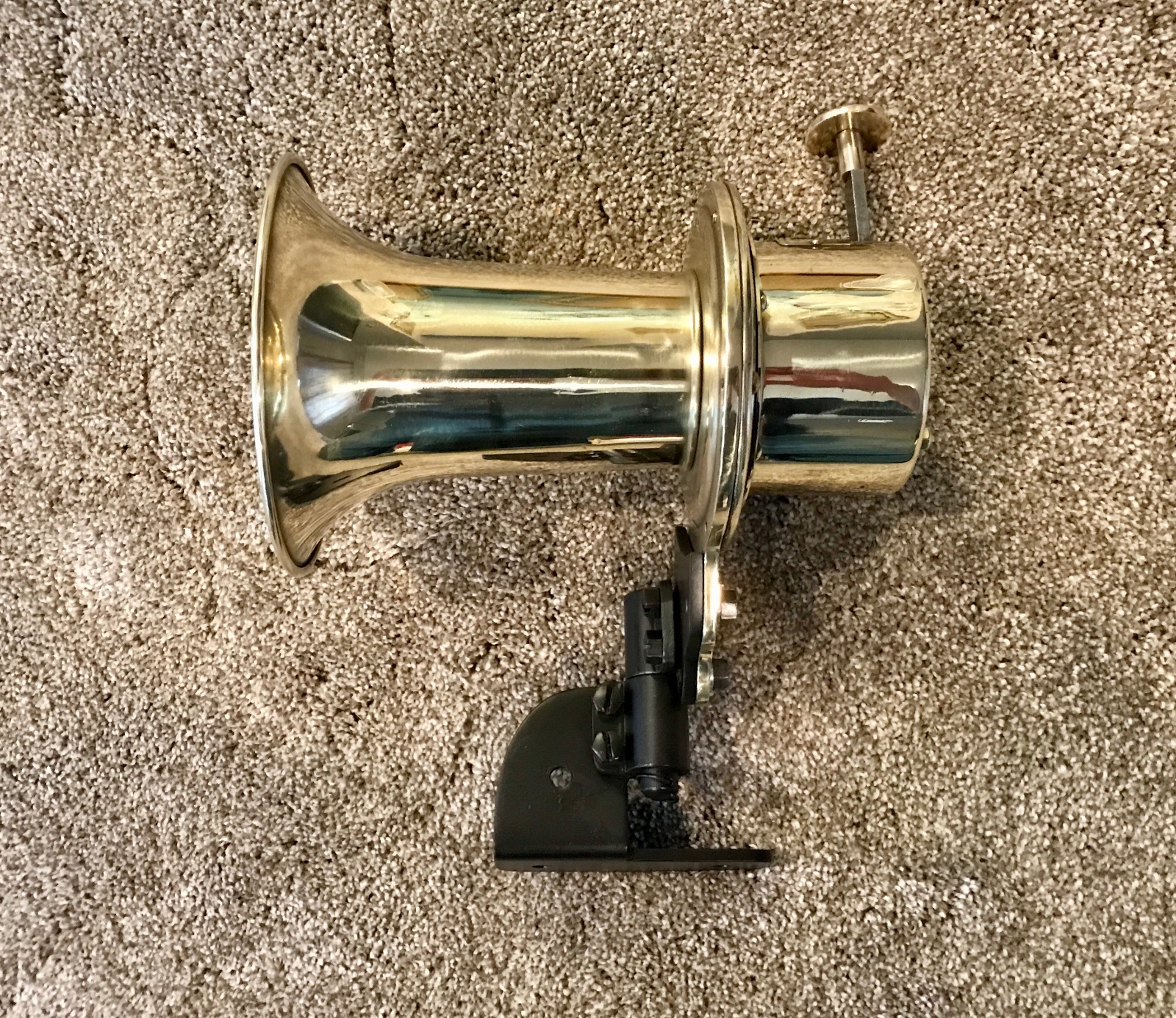 Original heavy solid brass G. Piel Company Long Horn. This is a beautiful all-brass hand operated horn. It is in great condition, no dents or cracks on bell. Weighs 7 lbs, 8.5 length, 6 inch diameter bell. It lets out a loud “AAAWHOOO!” when the plunger is pushed. The internals are very clean, lubed, and in wonderful condition, and operate as designed. It has a nice polish, with just enough age and patina evident. Very rare high-end heavy brass horn. Very expensive horn for its time. Very hard to find in all brass. Includes original pivoting mount. Very nice. 425 includes shipping.