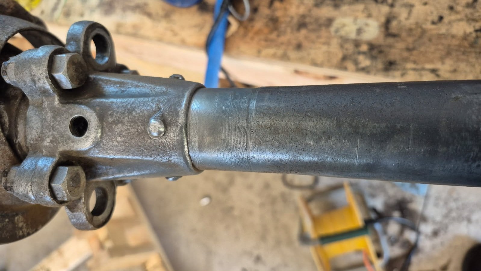 Here's some pics of the torque tube: I noticed something interesting on the tube, about mid-length, 4 equally spaced 'U' depressions, obviously some type of 4 point vice/grip. Not sure if these are manufacturing marks, or something else that occurred later. Anyone else ever see these?