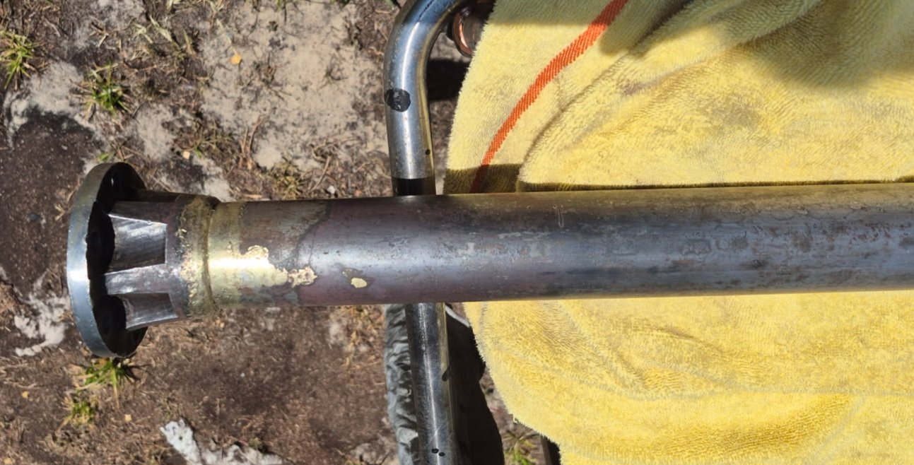 Here's some pics of the torque tube: I noticed something interesting on the tube, about mid-length, 4 equally spaced 'U' depressions, obviously some type of 4 point vice/grip. Not sure if these are manufacturing marks, or something else that occurred later. Anyone else ever see these?