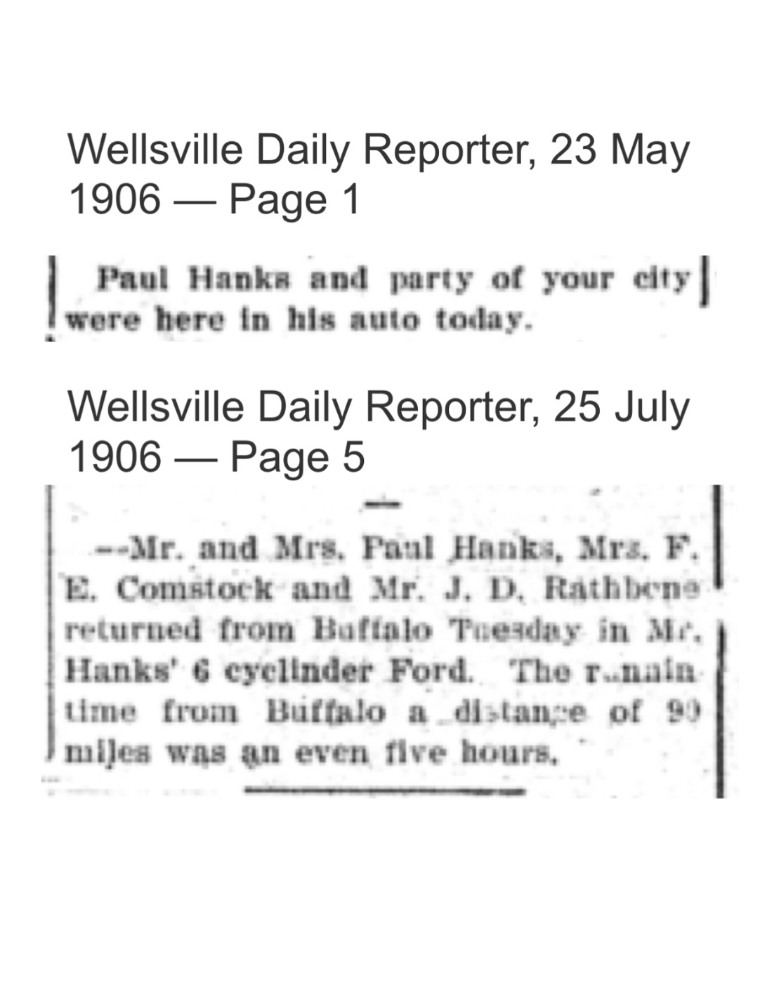 First, to confirm the letters time frame of when Hanks purchased hid Ford six. In the article below Mr. Hanks drove his car home from the Ford Buffalo NY branch, dated May 17, 1906. In the letter Hanks reported buying the Ford on May 18th. Close enough.