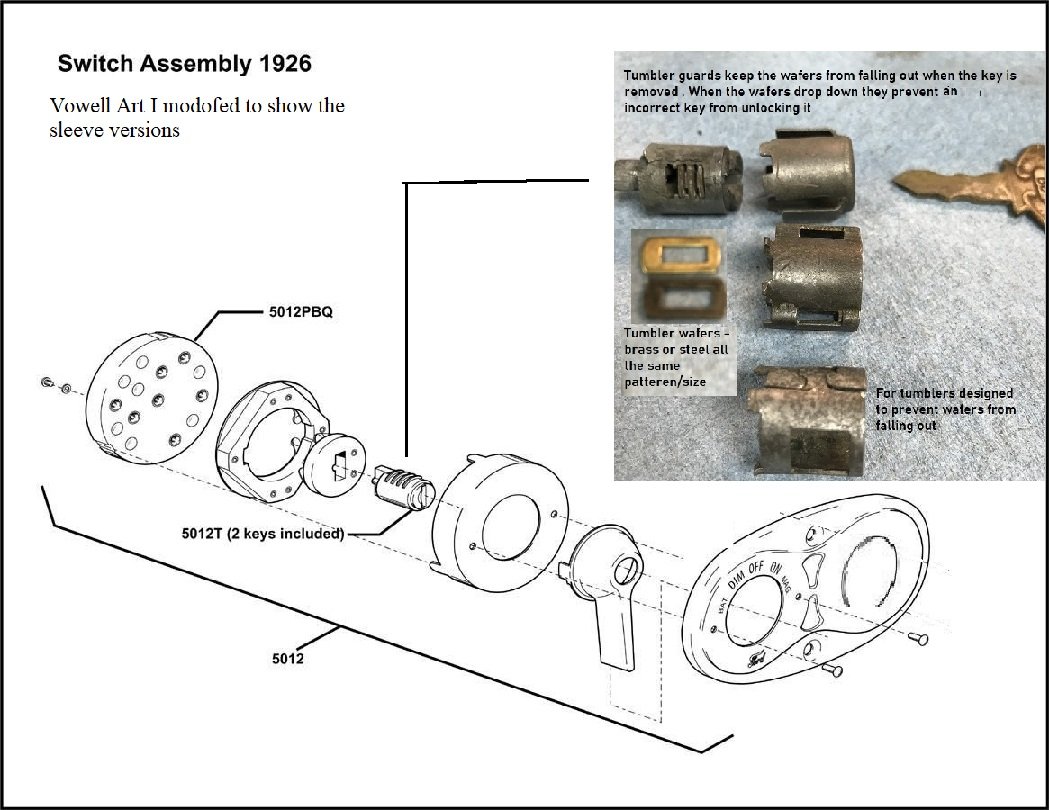 The repro cylinders don't fit very well (note they say for use without the sleeve that fits over the cylinder). That's what the wafers fall into to cause a lock. The diagram is a generalization of the assembly as there are two different backing plates (clip & pin types) and the method that the sleeve & handle attach to large & small contact disksmicshotrodgarage wrote: ↑Thu May 15, 2025 12:31 pmFrank, That would be the one I need. I do have the nickel face plate part, So I'm hoping I can use parts from the one I picked up and make it work? I have seen the replacement parts for these, but I didn't see a separate lock cylinder available? Also I'm sure a member of the clue here might have one to sell, see what I can come up with the parts I have first. Might need to ask your advice as I go along if you don't mind. Thanks...mike