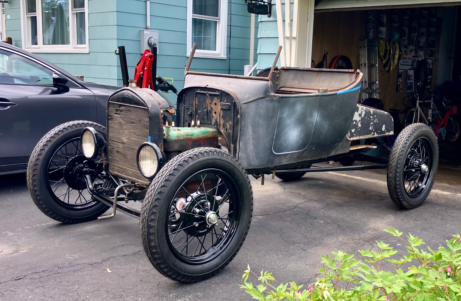 Mocked up my a powered t roadster a little more. It’s nearly 50/50 model a and model t. Model a engine and trans. Model t rear axle. Model a front axle and steering box.