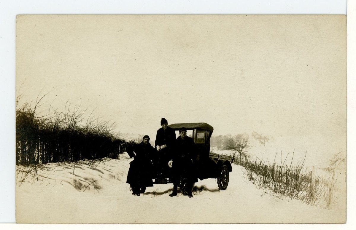 This last photo is a bit of a mystery to me. Is that a pet badger, teddy bear or dead gopher he is holding? It's staged to look like one of the youngsters is driving. I see a pair of feet under the far running board.