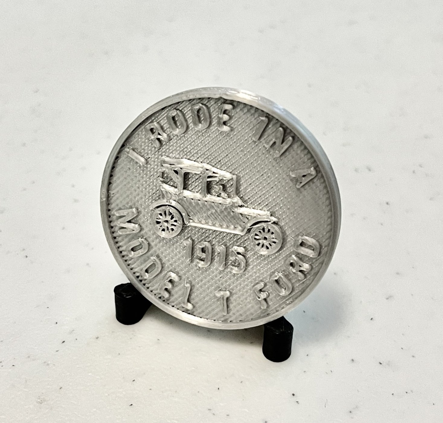 18 months ago, I got my grandkids a 3D printer. About a year ago, I guess they got tired of me coming over and using it all the time, so my kids and grandkids got me my own printer for my birthday, and I have enjoyed learning how to use it. I mostly make toys for my grandkids and a few useful items for myself. Recently, I had a thought that maybe I could 3D print a coin to give to my Model T passengers after their rides; something of a souvenir they could take home to commemorate their ride in a 110-year-old car. After a few iterations, I ended up with something suitable and printed up a batch. The response has been tremendous, and past riders have been asking for theirs! It has been so much fun to present them with their own coin, and I also give them a small display stand I printed.