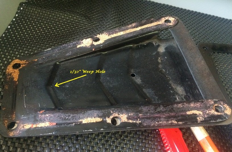 I went with 3 places and a little bigger then shown in the above photo, 3/32. Looking at the one in above, think it is bigger than 1/32. Drilled one where it is shown and one each corner at the bottom. As much oil as was pushing out the top where I needed to seal better, at a fast idle, think they will be ok until getting pluged up as Wayne said.