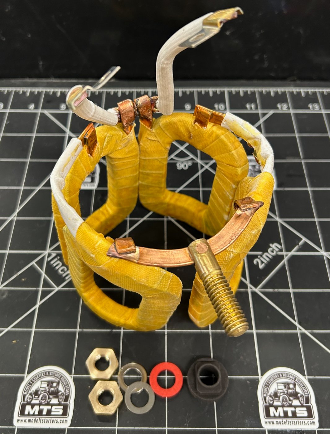 I got tired of spending over $100 on the Wilson field coils so now I make them. These are replicas of the original Model T field coils but are superior to the aftermarket Wilson field coils in several important ways. The post is solid copper and comes pre-installed with a copper stake and then silver soldered to the coils for maximum strength. Copper is MUCH better for post material, especially when you’re trying to cram as much of that 6v battery power into the starter as possible. The cloth field wrappings are each dipped in Epoxy, making shorted windings a thing of the past. The individual field windings are separated by a plastic insulators not cardboard so they will last a lifetime and more.