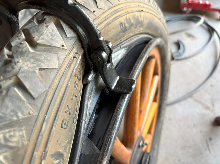 I first attempted the rear 30 x 3 1/5 tires which had been on for 30 years. The tool must be opened wider for the larger tire which reduces one hand leverage. I did consider making some extension handles for more leverage, again maybe a future project. No amount of squeezing (or pounding) would break the beads and I ended up removing the wheels and using other means. The tires were both very hard and difficult to remove, the tool was not useful and I set it aside.