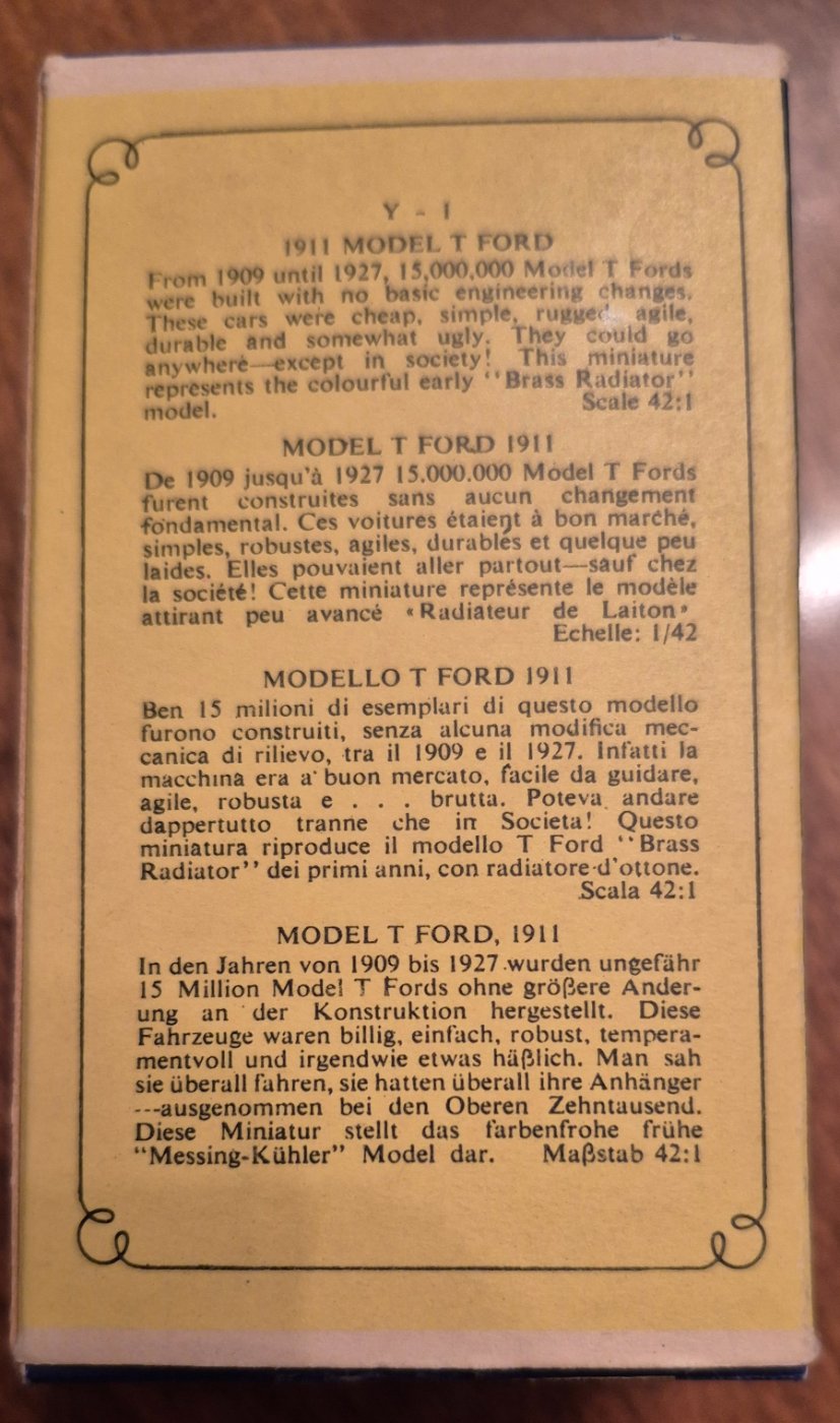 Also one of my first and favorite Matchbox Models of Yesteryear cars was Y-1, which they called a 1911 Model T. If you take a close look, you will realize that it is actually a 1912 slab-side body without the fore-doors. A 1911 car would have the step-side body. We won't even go into their color choice...