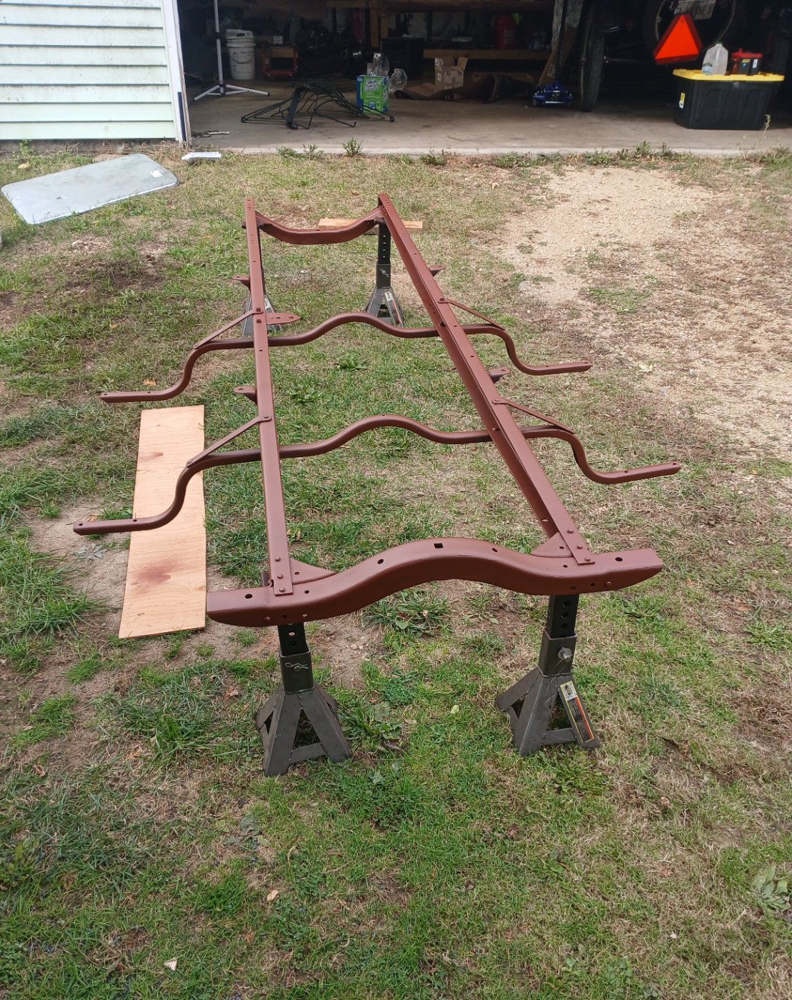 I disassembled, cleaned, and primed the leaf springs. Then I applied multiple coats of graphite spray, and assembled the two spring packs. The front spring went together pretty easy and I used all new hardware. The back spring pack gave me a little more trouble because of the contours and the fact that they are heavier duty. I ended up stacking the spring pack up until the clamps that hold the springs together, then with the rest of the leaves I turned them about 90° and was able to push the bolt through by hand without all of the leaves shifting on me and get the nut started. I tried the process of stacking all of the leaf springs and clamping them but had the issue of the leaves shifting on me and the hole for the bolt did not line up. I don't have any pictures of that process, unfortunately, because my hands were full. After the nut was started, I set the leaf spring down and pounded all of the leaves flat and tightened up the bolt. Then degreased any fingerprints and overspray from the graphite and painted with red primer, and then a coat of black rust-oleum. So far so good.
