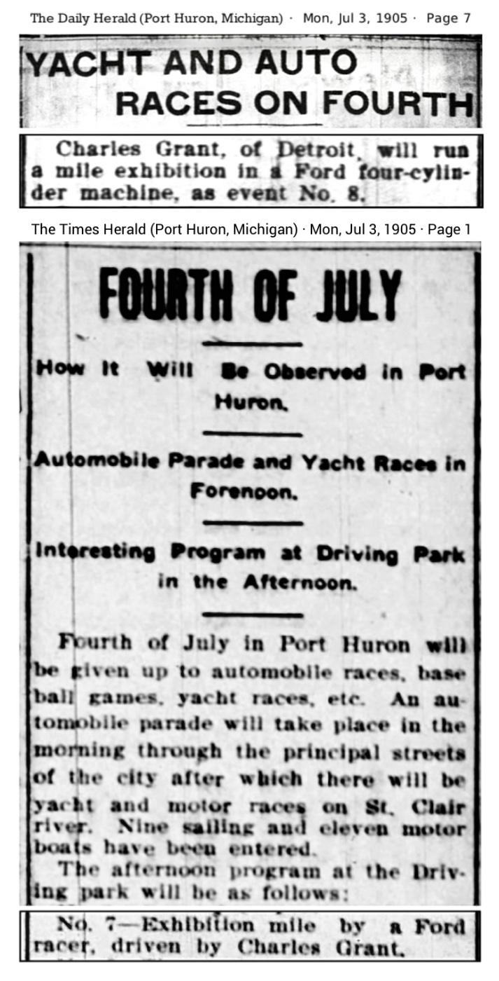 July 3rd, 1905, the city of Port Huron Michigan, just north of Detroit, announced Fourth of July boat and automobile races in local newspapers.