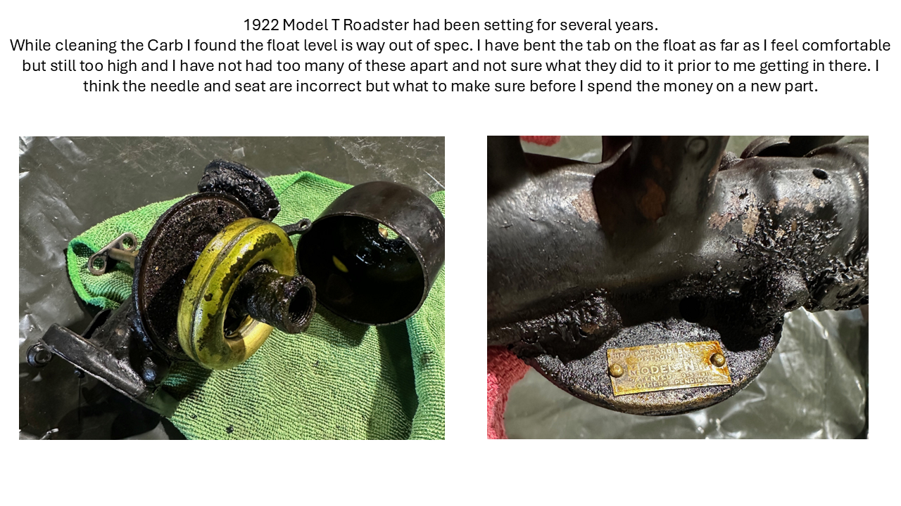 Hi Folks, it has been a while since I posted on here. A friend passed away and his son has asked me to help get there 22 Runabout going. It has been setting for several years, and I took the carb apart to clean it out. The float level was extremely high when I got it apart and I am not sure what the issue is. I would guess it is the needle and seat but would like to get the opinion of some experts. I have several pictures and think it might have an incorrect needle and seat, maybe too tall and that is causing the issue.