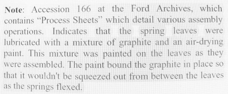 I have found traces of the original stuff Ford used, usually on the out-of- the-weather rear spring, and usually between leaves that did not nest as closely as they should. Whatever is used, it will not last long before requiring replenishment. Pressure points between leaves will soon displace the lubricant. The old time tools made to lubricate springs invariably used a charge of chassis grease as the lubricant.