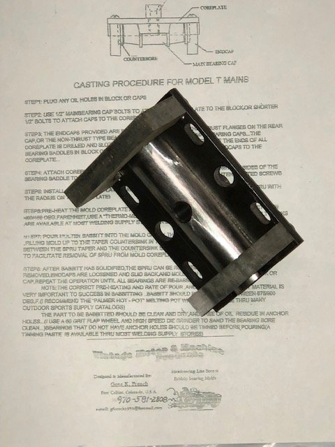 my original design Model T mainbearing mold will pour the babbitt bearings in BOTH the block and caps of the Model T Ford engine ... the bearings will be poured at 1 1/8" diameter to allow for finish machining as needed ... instructions are included as well as my phone or email support ... price is $125 plus $19.30 priority mail postage in lower 48 states ...actual postage outside this area or INTERNATIONAL ...Gene french ph. 970-581-2808 address : Gene French 49519 cr23 Nunn, Co. 80648