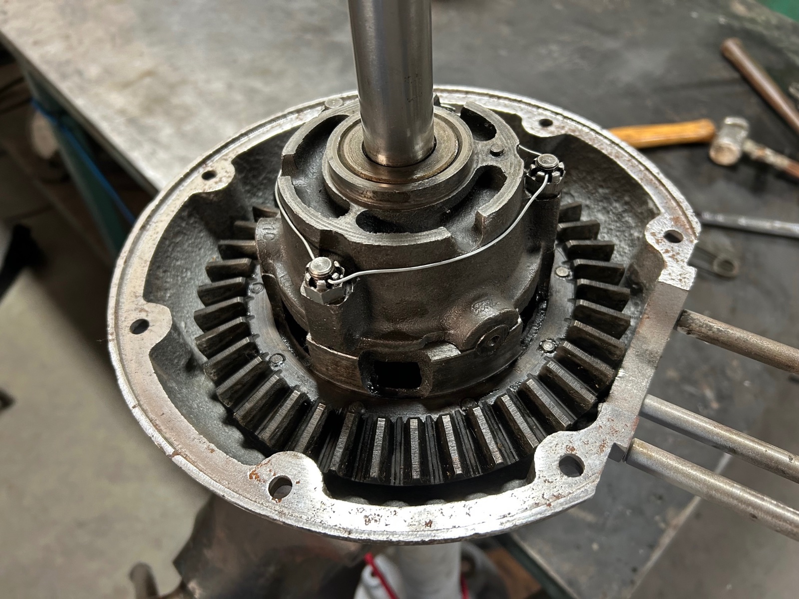 I got the bushing on the lower d/s. THE WORST JOB of this whole build. Fitting the U joint is simple. Put the axle back in the vice, split the halves, fit the pinion to the ring, removed the d/s. Siliconed the halves and bolted together leaving 4 front finger tight. Put the axle on the floor, siliconed the spool at the front and rear. Then dropped d/s over studs while guiding radius rods at top. Tighten everything up and wa-la . It is too heavy for me to lift so it will have to sit till Monday and the kids can put it back on the table.