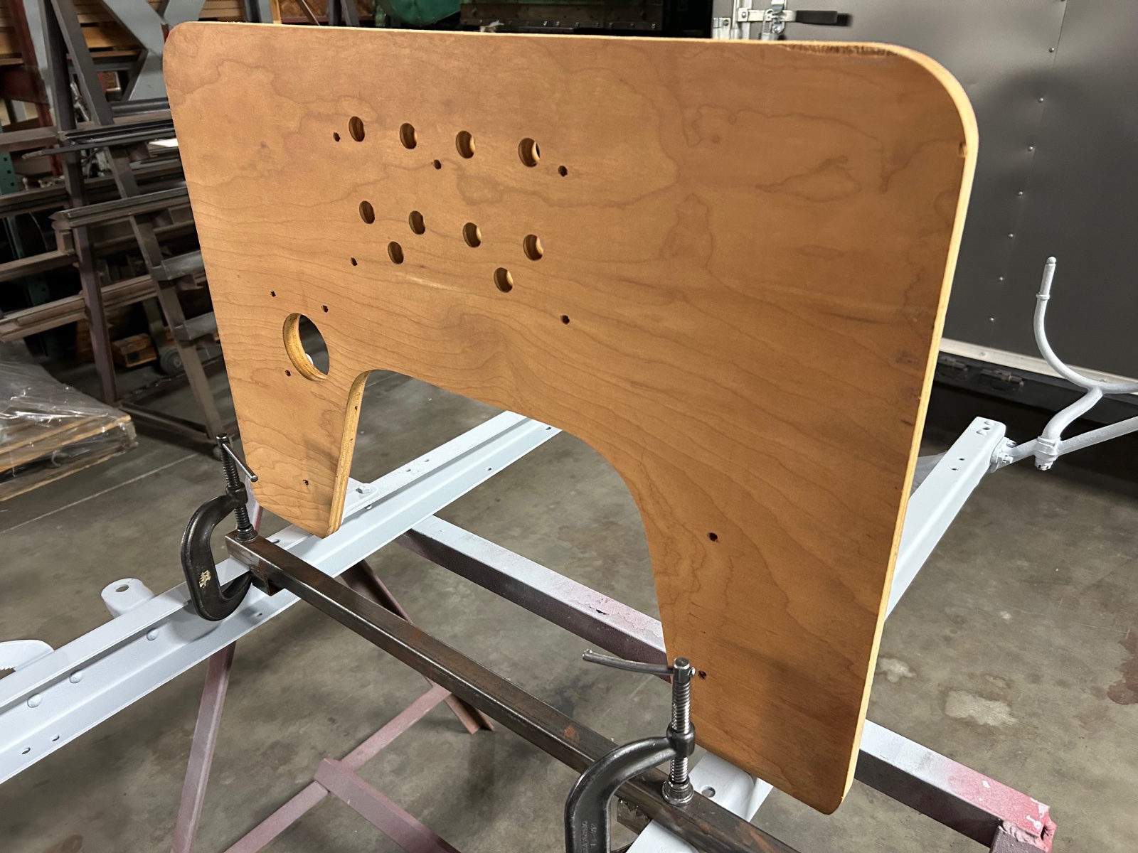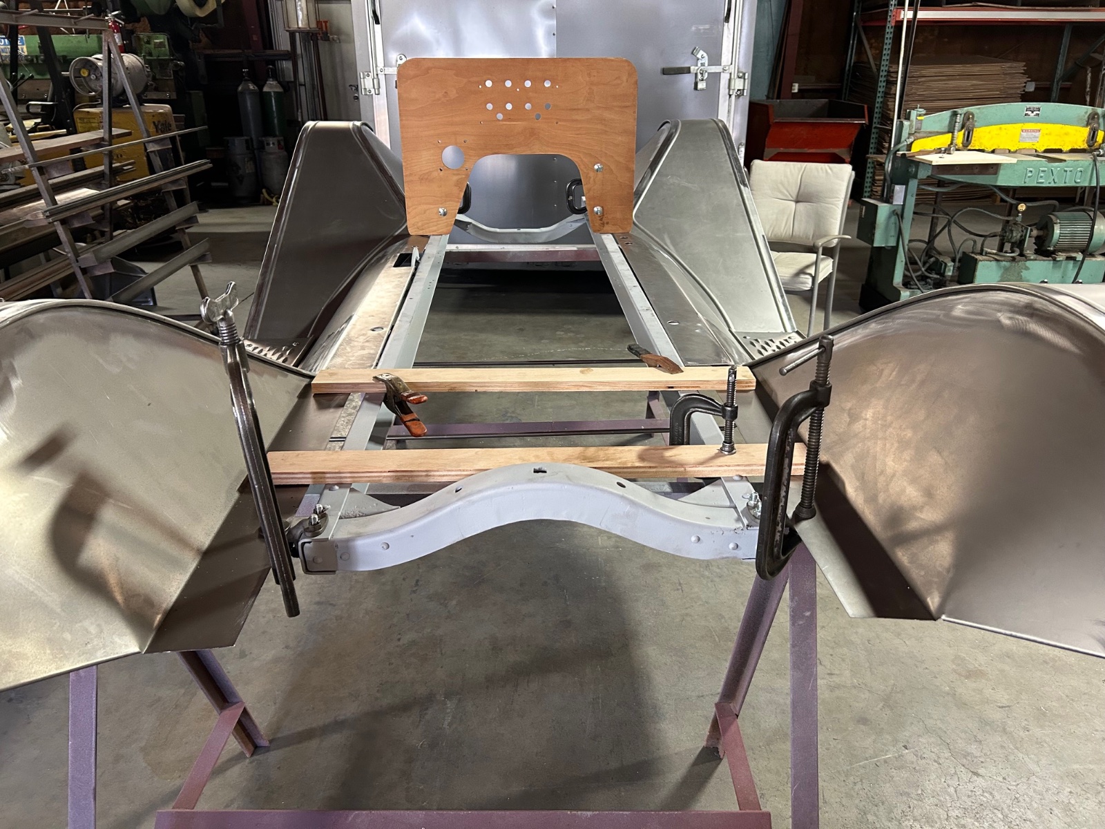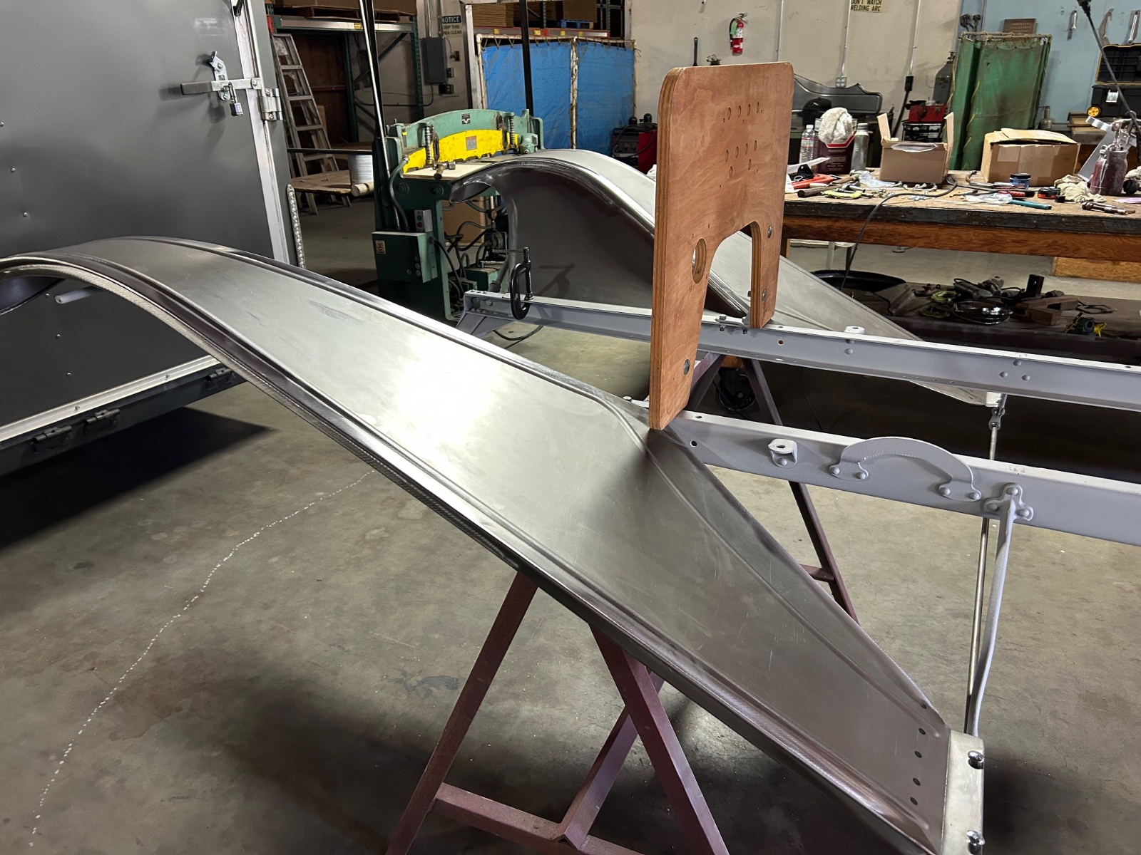 Found a Torpedo firewall in the wood shop. Looks to be a Seversons from 40 years ago. Some water stains that sanded off for the most part and a scare at the top that I think I can doctor. I used the r/b fixture to set the frame spacing ( 1/8” off ) and the pre drilled holes were very close.