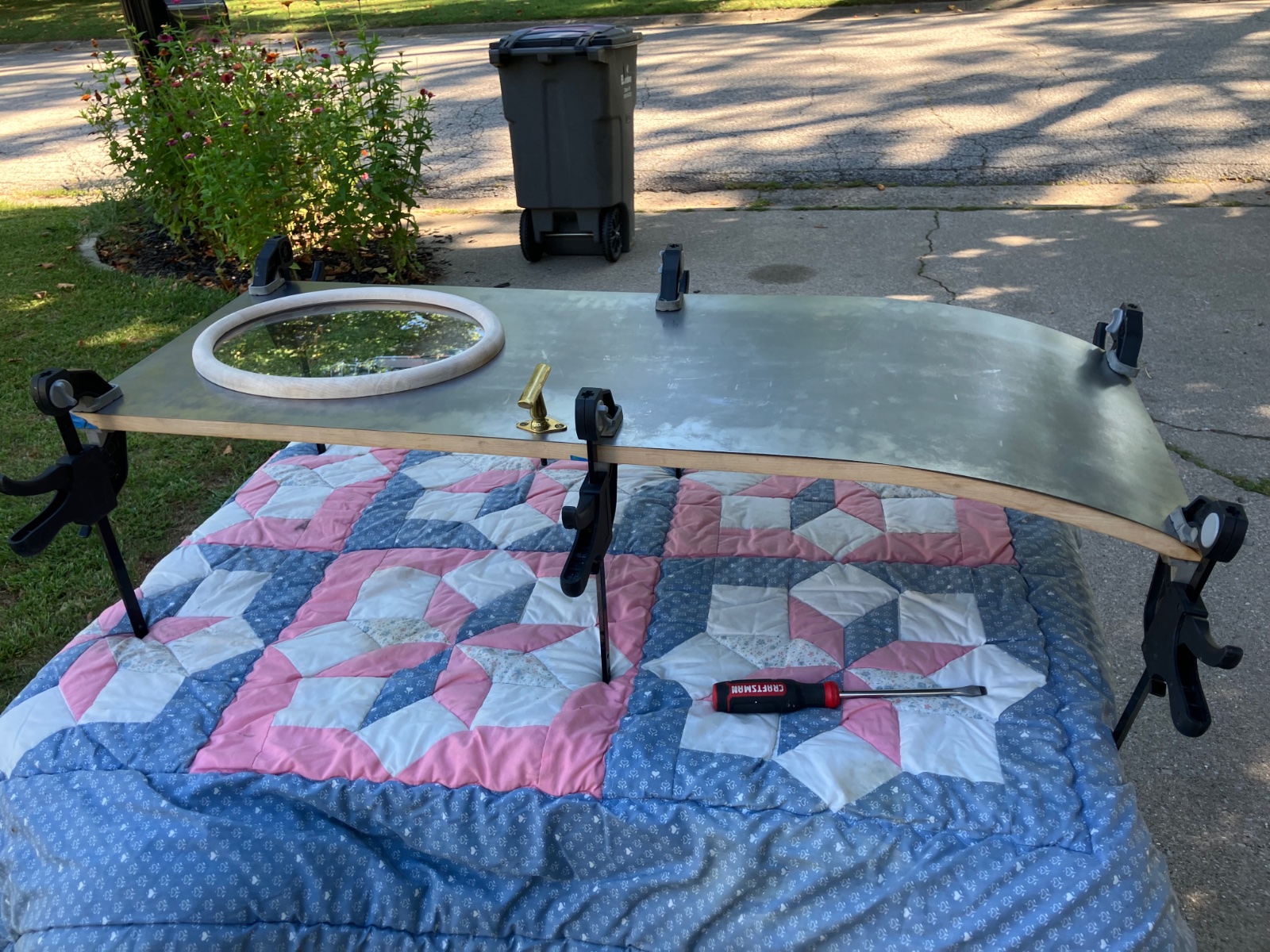 Mike, if you haven't already tacked the panels to the rear doors, it would be better to clamp a thin lath of timber over the panel with those same three clamps. This will help to load the panel more evenly against the frame rather than just at the clamping points.