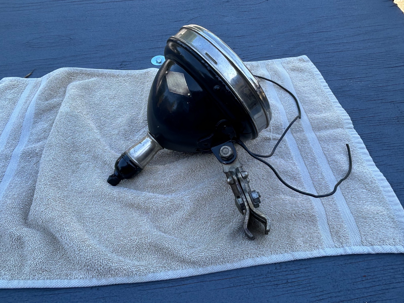 This is in really nice shape. I don’t know if it’s the original paint but it is in decent shape. The trim Ring, glass and reflector are in very nice shape. The wires have been replaced. This is untested but the switch pulls on and pushes off as it should. The Bakelite knob on the back has some minor deterioration and the handle trim has some small cracks.