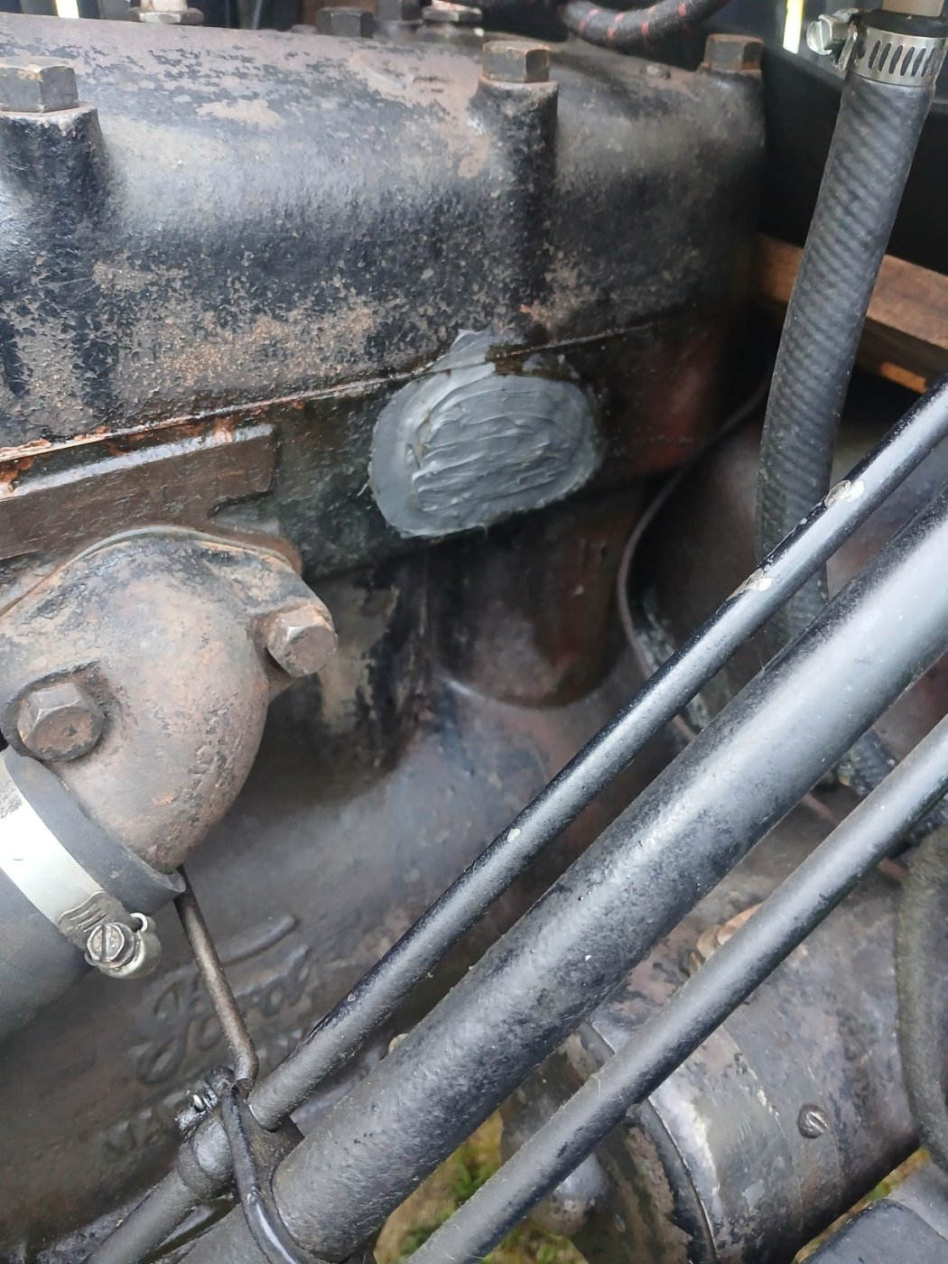I was looking my T over yesterday and noticed that the left rear half of the engine block was wet. It has always been a little moist near the bottom and since it never caused an issue, I just left it be. This time however, it was the whole side, up close to the head. I cleaned off the moisture and waited 20 or 30 minutes and noticed that it was seeping from below where the headbolts mount amd above the 'open' cylinder shaped part of the block. I wire-brushed the area and found a crack about an inch and a half long! Im confused on how, and why it appeared. This winter it got quite cold, aout 10 or 15 below at its coldest, however all fluid was drained and the head was off while I was replacing the valves. I just recently got the head back in and filled the cooling system with 50/50 antifreeze and water. I ran the car and have left the coolant in the engine. It has only gotten down to the teens some nights so it did not get cold enough to freeze the coolant. I tested the fluid and it was fine. I plan on just patching it with JB weld, or some sort of epoxy. I plan on replacing the engine regardless hopefully sometime later this year.