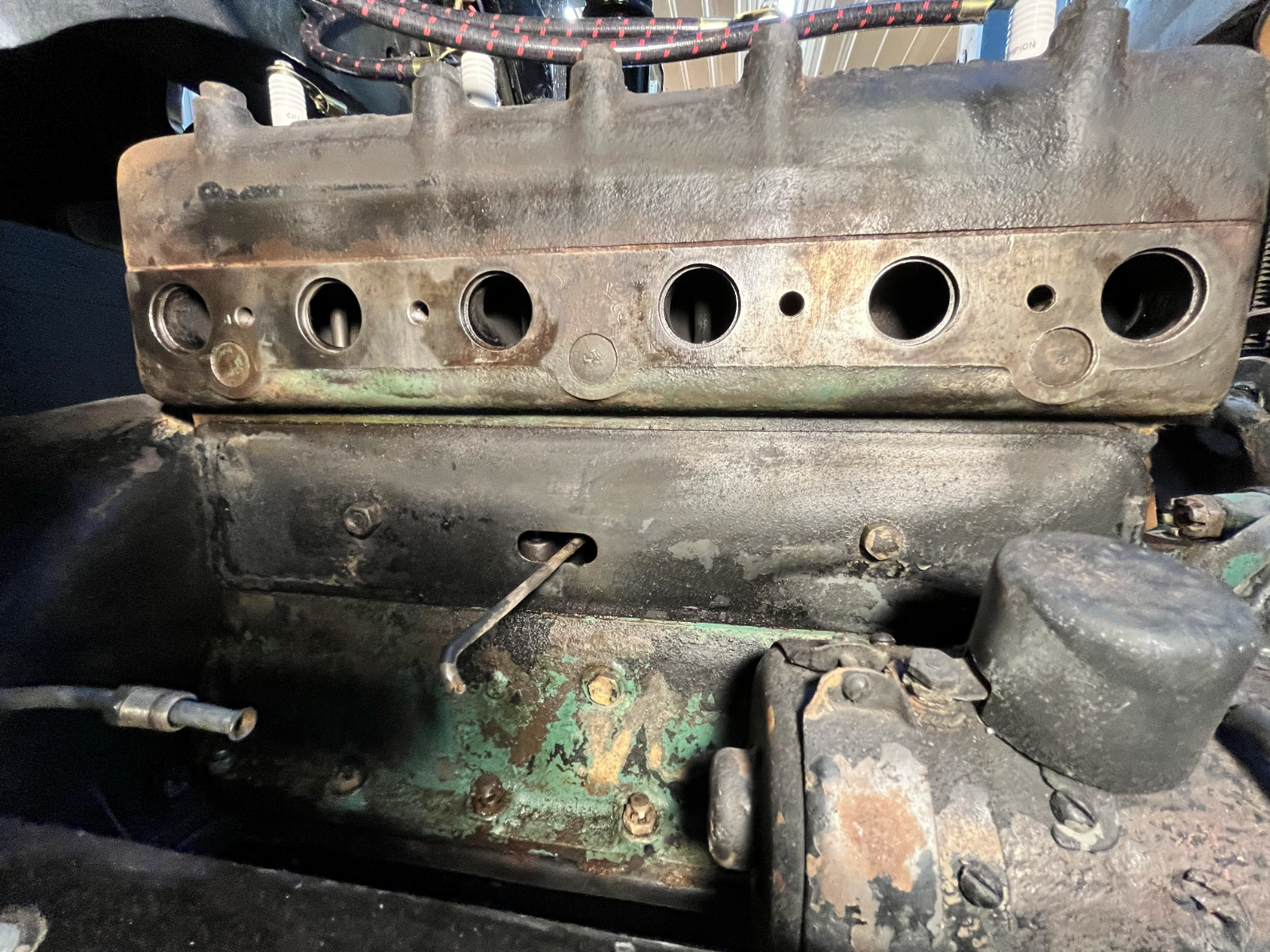 I'd definitely pull the head first to look for leak a source. There are a couple of spots on the block that look like there may have been a gasket seep at some point. I'd find a set of the steel braces that attach from the two top hogshead bolts to the rear engine mounts, too, and check for the late style pan braces.