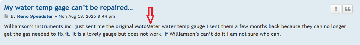A picture of your MotoMeter would help understand your issue. The expectation is that it is a radiator cap mount as opposed to a dash mounted.Reno Speedster wrote: ↑Mon Aug 18, 2025 9:44 pmWilliamson’s instruments inc. just sent me the original MotoMeter water temp gauge I sent them a few months back because they can no longer get the gas needed to fix it. It is a lovely gauge but does not work. If Williamson’s can’t do it I am not sure who can.