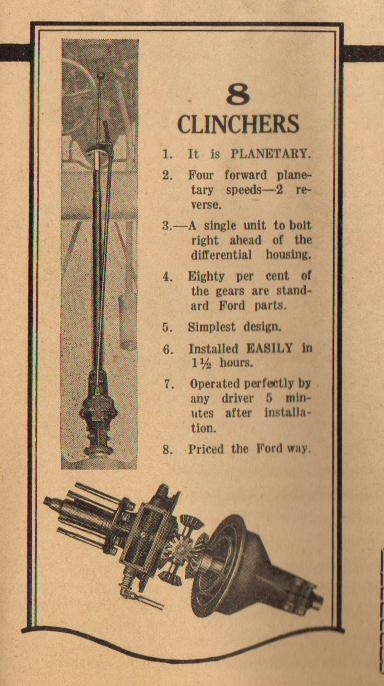 Starr also invented the basic Ruckstell. He had it at a trade show and Glover Ruckstell saw it. He bought the rights to it, redesigned it and made it into the Ruckstell. A couple years later, Starr came up with this design using mostly Ford gears and a very simple shift mechanism. Ruckstell sued him, dragged it out in court and eventually the court sided with Starr. But Ruckstell had stalled him and kept him out of the business to some extent, the other side of it was Starr got free publicity he could not have bought and made hay with some magazines that did stories on him and his sued with Ruckstell. The Starr was also quite a bit cheaper than the Ruckstell. He sold quite a few but not a lot. He did, I think, get some money from the lawsuit but not much. So he sold his design to Jumbo who fixed the problems with the shifter and put it on the market about the time the Model T was on the way out, roads were getting better and the competition for accessory transmissions was brutal.