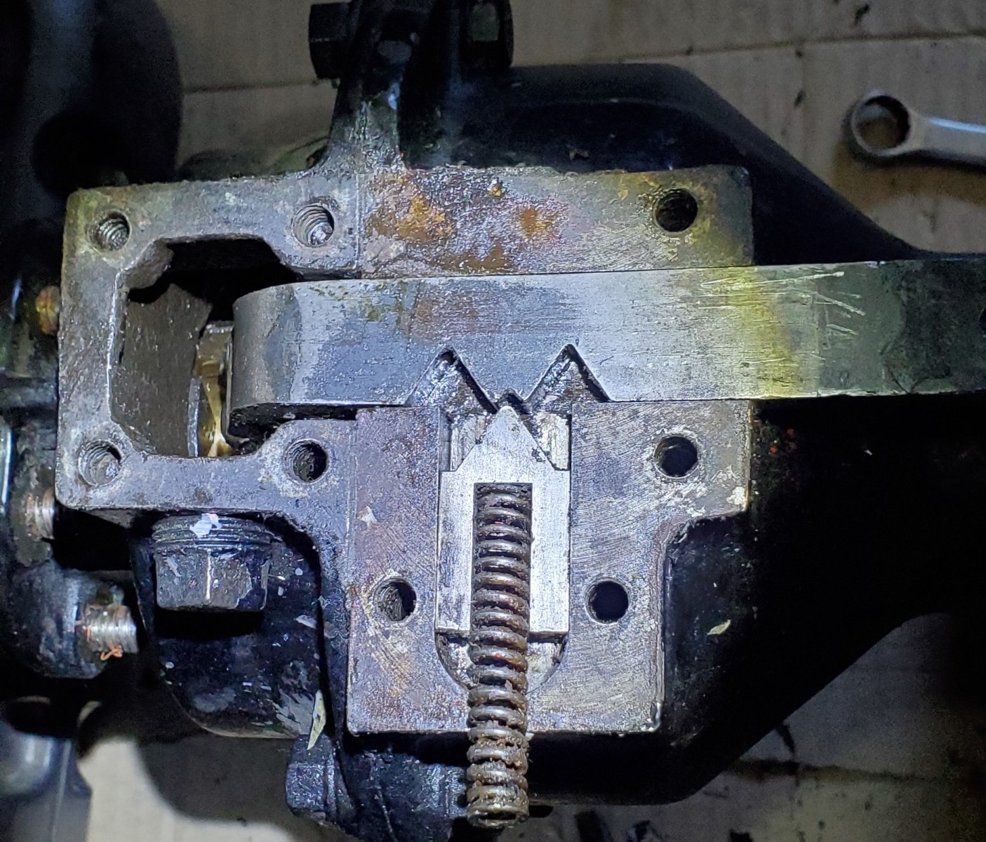 Post from 2008 with view of shift rod attached. Owner claimed his got into neutral unless he held the shift forward. Shift bar in unit in out position is normal gear, in position is low range. At least think so, as the lever in the cab is pulled back the rod would pull the shift bar out,