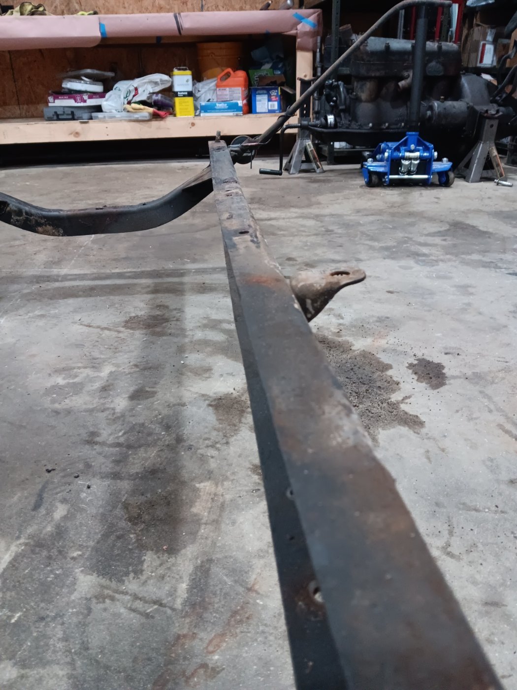 As for the car, it didn't look too bad, but I've torn down the whole car just the same. This car has seen it's fair share of adventures, to put it lightly. It is FULL of bondo and galvanized steel paneling. I knew it was cobbled together, but I didn't think it was as bad as it is, until I pulled it apart to really look. I started by pulling the rear end, which in hindsight wasn't the brightest thing to start with, but oh well. I pulled the motor, fenders, and the body and front axle too. The frame was tweaked multiple ways, and the accident only tweaked it more. The rails are racked about 1/2 inch, likely from the accident, however there's a lot more wrong with it than just that. I've got a better frame to put under it, and will likely use that. The right frame rail is bent 3 different ways. Its pushed in from the side about a 1/4 inch, bent where the engine ears sit and twisted longitudanly. I had an idea it was messed up when I put the motor in and saw it almost rubbed on one side of the e-brake crossbar and had an inch on the other side. The car tracked straight and didn't pull at all, so I left it.
