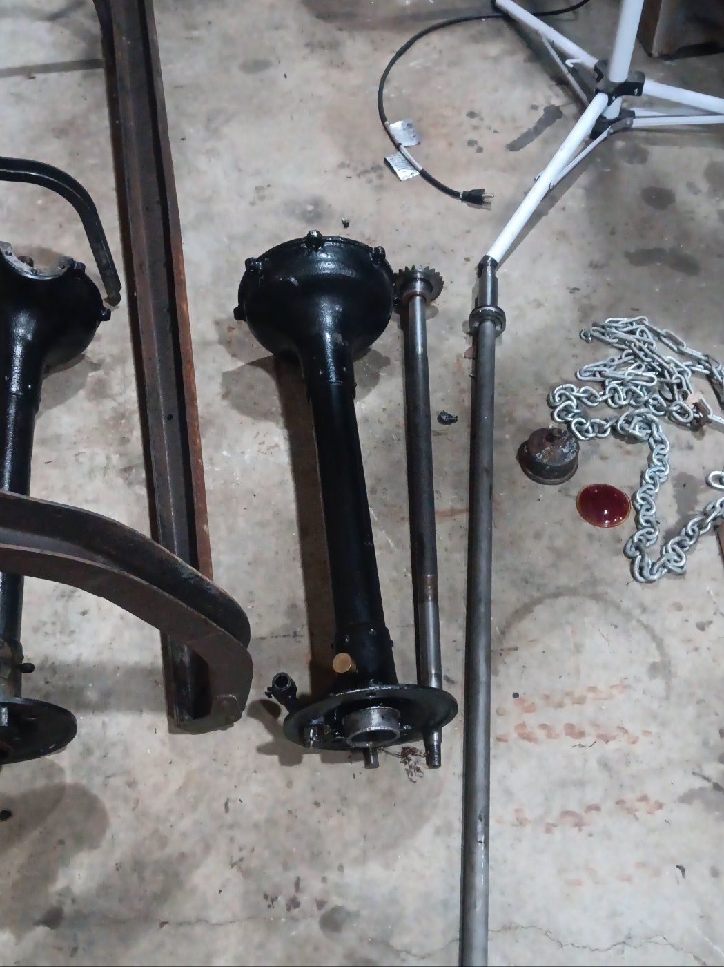 The rear axle took the brunt of the hit, and bent the housing and likely the axle. I'll probably never know, as I pulled the axle apart and the right side will probably never come apart. The housing is too bent to let the axle out and the inner hyatt bearing got cockeyed. Good thing its a standard T housing. The radius rod got bent, but the driveshaft looks ok, although it's getting a look through as well. The front axle should be ok, and the motor is getting replaced regardless. It was only temporary to begin with.