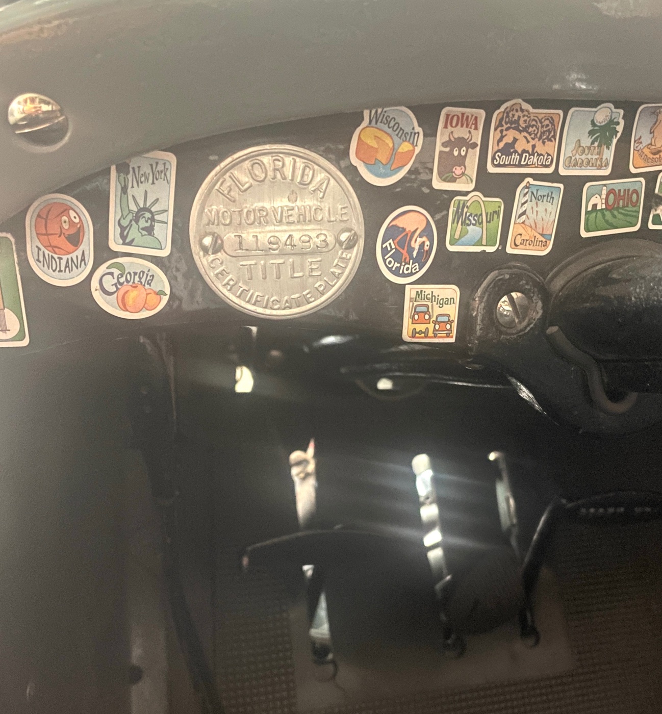 Those are title registration metal discs, state law had a fee to purchase, required to mount on firewall or dash, supposed to prevent theft.