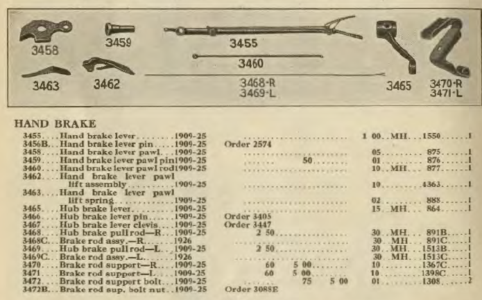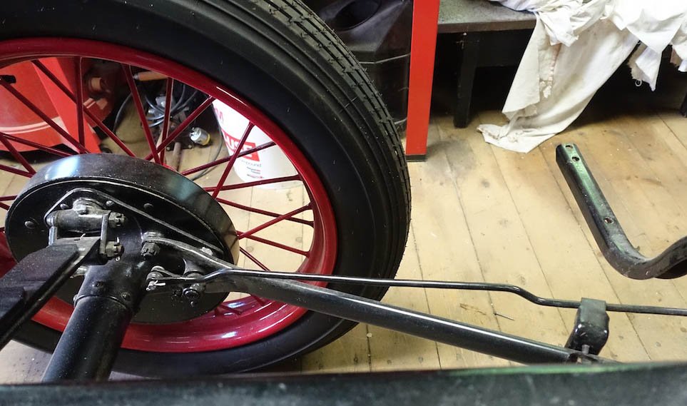 Be sure that you don't get them too tight. The lever also puts the car in neutral and should be in neutral with the lever approximately straight up. Then when you pull it back it should go a few notches before it applies the parking brake. Otherwise you will not be able to use the neutral with the lever. It is actually much better to use the lever to hold in neutral when waiting at a signal because the foot is unstable and might be slipping the low drum or the clutch disks, but the pedal will be set for the best neutral position.'