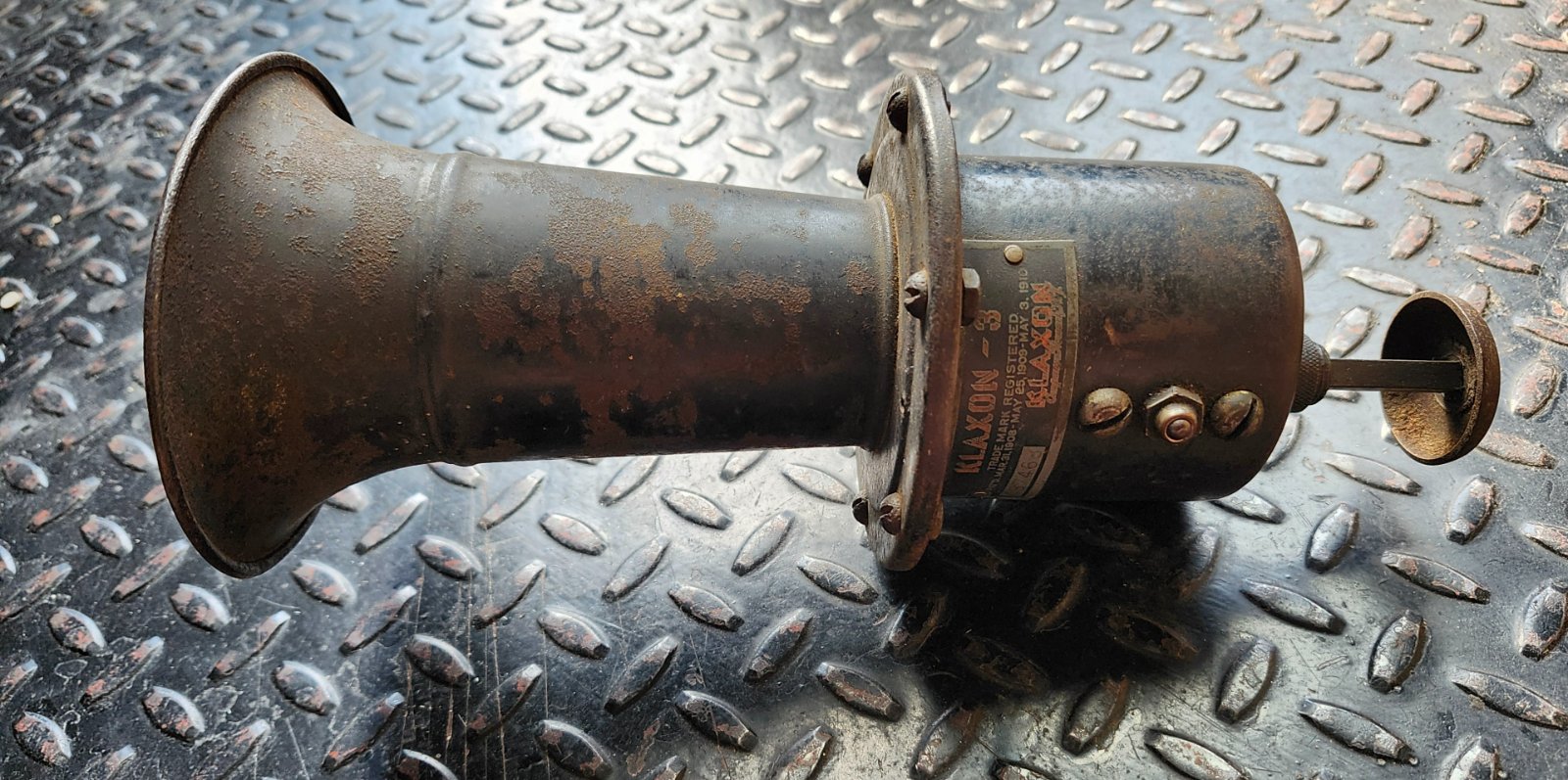 Sold to Washington!! This Klaxon horn is about 11" long, 6" tall and 4" wide. It has the mounting bracket and a nice original Klaxon plate. Really nice original and blows LOUD! Price is 185.00 including FedEx Ground shipping with insurance in the USA. I don't check messages here but call me at 734-730-4274 or email me directly at motoringicons@hotmail.com Thanks.