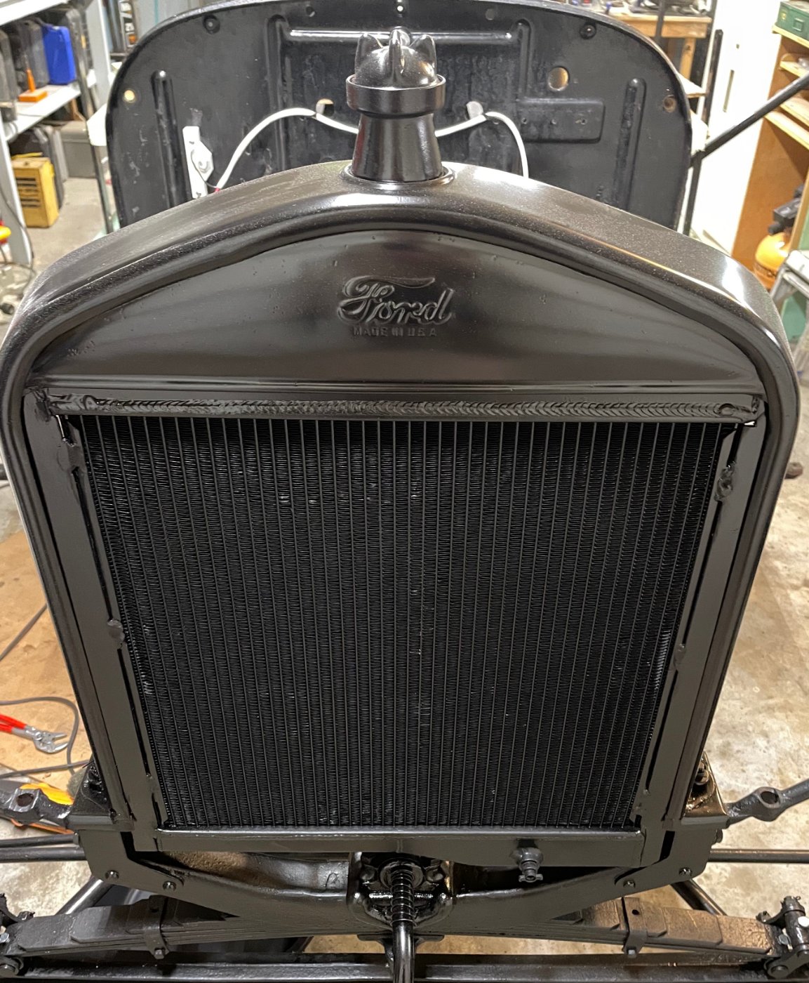 Not to steal Jason's thread or ingenuity, but if you're going in this direction, here's another cheaper solution with all parts needed ( less taxes and shipping ) for ONLY $184.40 ! The radiator to begin with is a 24-27 Ford T street rod radiator from RADIATOR CLUB. It is a 3 row, flat tube, aluminum radiator made to the dimensions of an original 24-27 T radiator and will fit under an original tall shell. It even has tabs on the side to mount on a Model T frame. Next, is an aluminum filler neck which accommodates an original T radiator cap from DILLON RADIATOR. It will need to be welded on the top tank in the position to match the shell filler neck opening. As this radiator is pressurized, it has a pressure cap filler which can be left if pressurization is desired, or removed and filled shut if the top neck was made functional. The outlet on the bottom tank is on the driver's side as the original, but the inlet is on the passengers side. it will have to be removed and the hole filled. A new provision for a radiator support rod will have to be welded on to the tank but that design is up to you. The new aluminum inlet ( from SPEEDWAY MOTORS ) will need to be welded to the center of the top tank, and that completes your radiator for $184.40 for parts. Welding labor (if you can't do it yourself), taxes on parts, and shipping on some parts (some may offer free shipping) is all the extra expense to finish. If your building a "driver", and NOT a show car or truck, this is a heck of a lot more affordable than a new brass radiator.