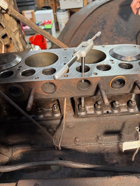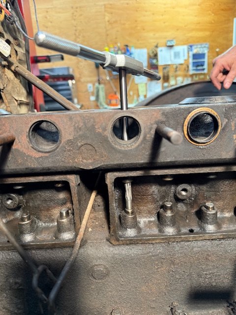 Attached are a couple of pictures showing my 1919 engine getting reamed. The standard .312 valves wobbled around in the guides. The engine machine shop owner who was helping me said the wobble was too much. So I decided to install .327 valves, which required reaming. I asked the machine shop owner do it. In the picture you will see that the bottom of the reamer does not have grooves on it. It follows the existing valve guide, as per the description on Snyder's website. I measured the width of the bottom "plain" end of the reamer and it was made to fit .312. After reaming the first guide he slipped a valve in then pulled it out and a smile crossed his face when it made a nice "POP" sound.