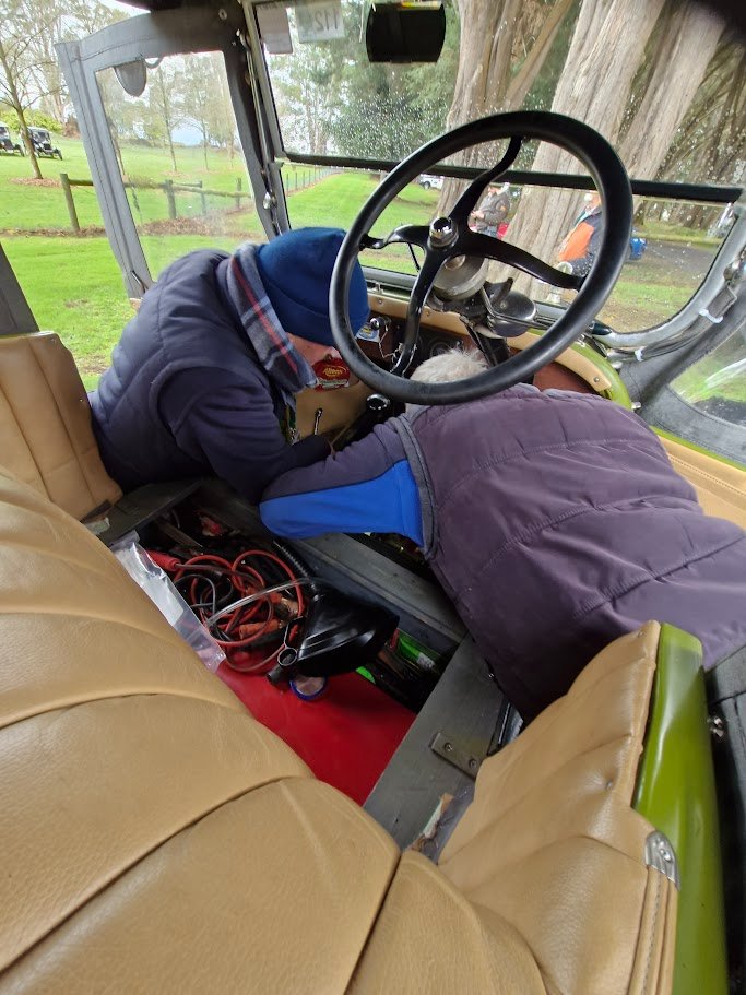 Here's a few more pictures from the rally. It was a wonderful week of touring around some delightful historical locations in an area established from the discovery of gold in the late 1800's. Lots of beautiful buildings and nice quiet country roads to drive on. Caught a picture of Allan working away at a lunch stop repairing a noisy fan, also another entrant adjusting bands! Around 450 miles travelled for the week.