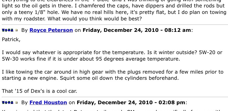 For years I ran straight 30w in my previous T. Was a little hard to hand crank in a Pennsylvania winter. In this T I had been using 10w 30 since the rebuild three years ago. Nevertheless ... the 30w oil made a big difference all around. Lets see how long I can feel the difference. I drive about 100 miles a week.