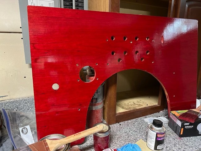 2) I mixed 1/2 a tube of the paint with 4 ounces of mineral spirits and used it as a "stain". It soaked into the new firewall from Snyders reasonably well, but not as well as the Laurel Mountain Forge stain that I used on our 1911 firewall. I repeated the process until the mixture was out.