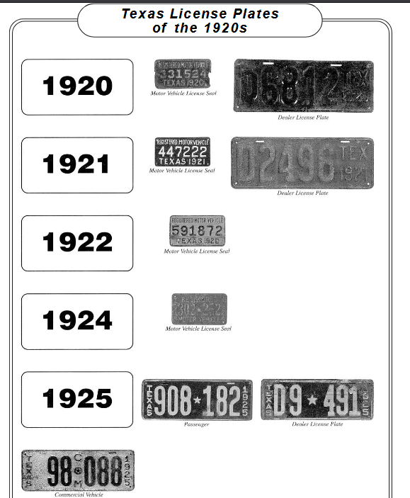 The larger plate is a 1919 TEXAS plate has vertical TEXAS left & right. The 1925 plate has TEXAS on the left but the year on the right. The smaller plate underneath appears to be a "Motor Vehicle License Seal" issued each year retaining the original plate. Possible for 1922Shannon_in_Texas wrote: ↑Tue Oct 14, 2025 11:31 pmWayne, #8's larger license plate looks like a 1923-24 Texas plate to me.